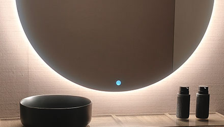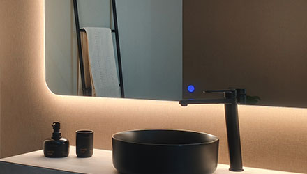Diseño que inspira. Tecnología que simplifica. — Cada uno de nuestros espejos está equipado con iluminación ambiental trasera, un foco superior retráctil y activación táctil, para que disfrutes de una experiencia única frente al espejo.
