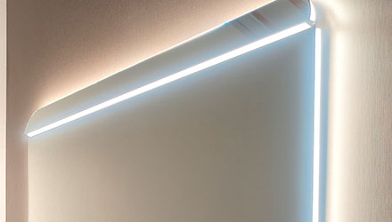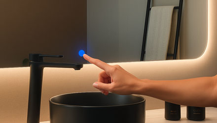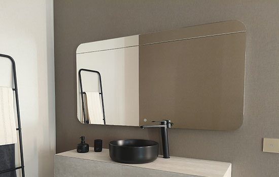 Este modelo de espejo rectangular con bordes redondeados aporta armonía visual y calidez, con la misma tecnología de iluminación ambiental y foco retráctil activado con un toque.